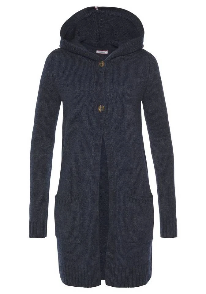 Perfekt zum Überziehen: Die Strickjacke von Kangaroos verleiht jedem deiner Outfits eine lässige Note. Der Cardigan in Oversize-Form umspielt locker deine Figur und schließt mit zwei Knöpfen in Hornoptik. Breite Rippstrickbündchen, eine große Kapuze und zwei aufgesetzte Eingrifftaschen runden den entspannten Chic des Strickmantels gekonnt ab. Kommt besonders gut im Cross-Over-Look mit einer langen Bluse, einer schmalen Hose und Stiefeletten: die Strickjacke von Kangaroos.