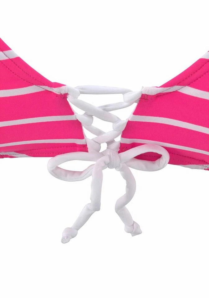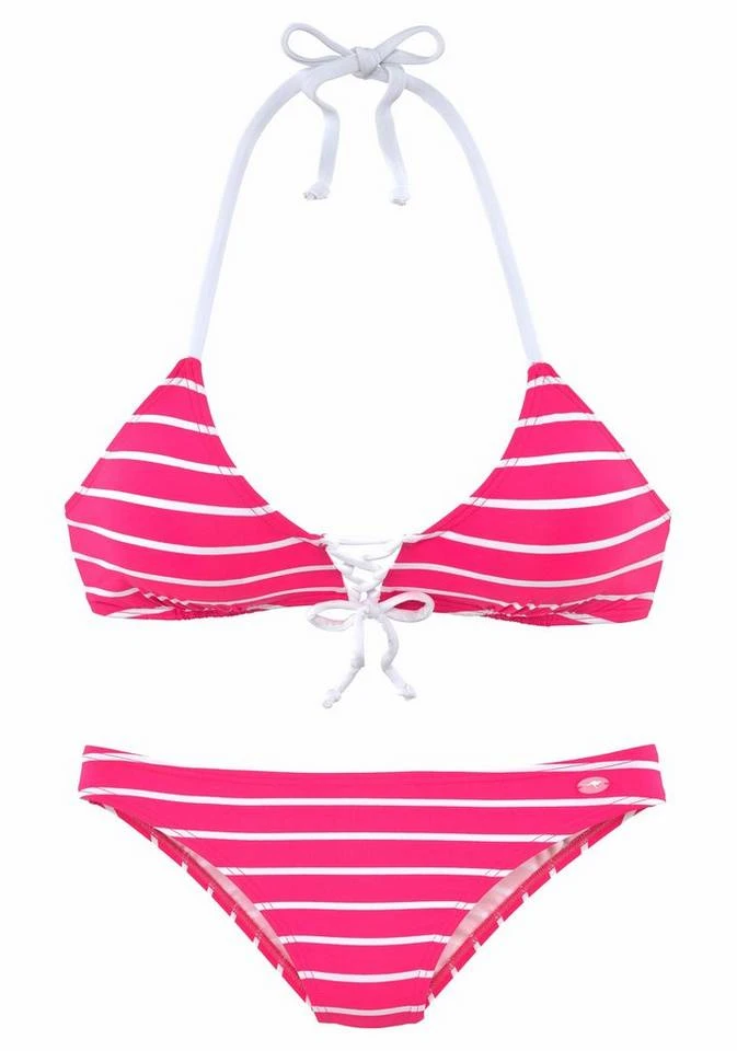 Der Triangelbikini von Kangaroos kommt im trendigen Streifendruck daher. Die angesagte Schnürung des Neckholdertops zieht alle Blicke auf sich – ob am Strand oder am Pool, mit dem gestreiften Zweiteiler ist man immer perfekt in Szene gesetzt. Das Bikinitop wird im Nacken gebunden und am Rücken geschlossen, das Bikinihöschen überzeugt mit der knackigen Passform. Der maritime Look ist nicht nur für Wasserratten geeignet. Auch an Land macht der Triangelbikini von Kangaroos eine gute Figur.